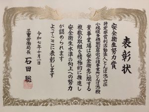 10月1日、三重県産業安全衛生大会にて表彰していただきました。