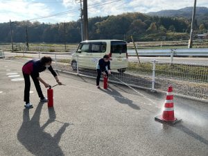 その後、水消火器を使用して消火訓練🧯